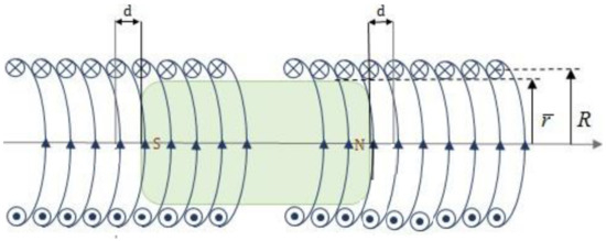 The ESA configuration [1]. The green section represents the soft permanent magnet with a radius of , and the north (N) and south (S) poles are labeled. The spirals represent the loops, with arrows denoting the direction of current flow. Additionally, R is the average radius of the coils, and d represents the axial distance from the soft permanent magnet poles to the midpoint of each coil.