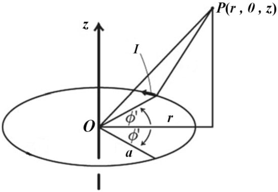 where is the permeability of free space, I denotes the current flowing through the coil, r and z are the radial and axial coordinates, a represents the radius of the loop as defined in Figure 2, and along with are the complete elliptic integrals of the first and second kinds, respectively, as represented in the following equation: