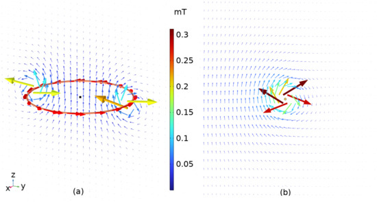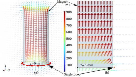 Total magnetic field B vector of a single loop and a cylindrical permanent magnet for COMSOL models in (a) 3D and (b) axisymmetric 2D. The magnitudes are color-mapped based on the color bar at the center. B field contribution from the permanent magnet dominates.