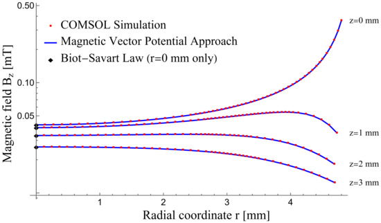 Figure 4 illustrates the axial component of the magnetic field magnitude () at four specific axial distances—, 1, 2, and 3 mm from the XY plane—where the single loop is located. The plot shows the variation of the magnitude as a function of the loop’s radius and contains from COMSOL, the MVP approach, and the Biot–Savart law (just at the center) for the four aforementioned z levels. As shown, the COMSOL simulation and the MVP approach are in excellent agreement. Notably, along the axis of the coil, the results from the MVP approach and the Biot–Savart law align closely.