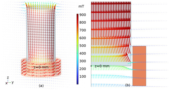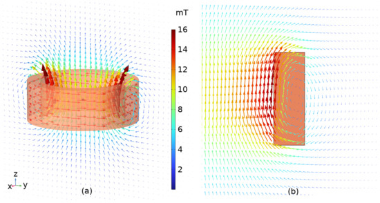 Total magnetic field B vector of a multi-loop coil and a cylindrical permanent magnet for COMSOL models in (a) 3D and (b) axisymmetric 2D. The magnitudes are color-mapped based on the color bar at the center. B field contribution from the permanent magnet dominates.