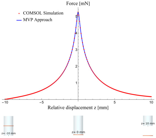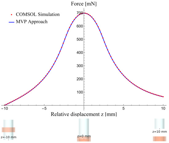 In Figure 8, the z-coordinate represents the position of the south pole of the permanent magnet. At mm, since the coil is located exactly in the middle of the magnet, the forces from the south and north poles perfectly cancel each other, resulting in a net force of zero. At mm, the contribution from the south pole reaches its maximum, while the contribution from the north pole becomes negligible. At mm, the net force is significantly reduced due to the 10 mm separation between the south pole and the surface of the single current loop. The forces calculated using COMSOL and the MVP model show excellent agreement, as expected.