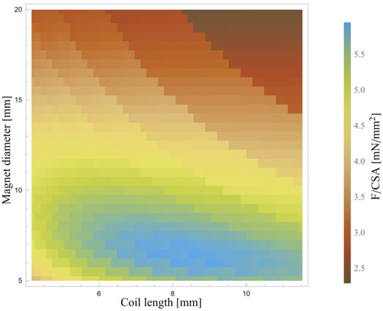 Generated force to unit cross-sectional area, while the magnet diameter varies from 5 mm to 20 mm, and the coil length ranges from 4.2 mm to 11.5 mm. The consumed wire length is approximately 10 m.