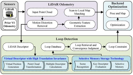 To solve the above problems, this paper proposes VS-SLAM, a novel and robust SLAM system that leverages virtual descriptors and selective memory storage to enhance LiDAR loop closure detection in challenging environments. The system framework is shown in Figure 1. It is worth noting that due to potential degradation when performing L-SLAM in geometrically similar environments, inspired by the works in [25,26,27], which highlight the challenges of degradation in L-SLAM systems and propose strategies to address these issues, we introduce visual-inertial odometry as a priori odometry to constrain the degradation direction of L-SLAM. Additionally, in non-geometrically similar environments, the main role of visual-inertial odometry is to provide an initial guess for LiDAR odometry optimization, further enhancing the efficiency of the system. Although a constant velocity motion model can replace this role, the introduction of visual-inertial odometry still provides more stable and accurate initial guess estimation for the system. The system is developed based on LVI-SAM [28] and consists of three main parts: LiDAR odometry, backend optimization, and loop closure detection. Similar to LVI-SAM, VS-SLAM adopts a multi-sensor fusion framework, combining LiDAR, visual, and inertial measurement unit (IMU) data to improve system robustness and accuracy. Additionally, both systems utilize visual-inertial odometry to provide prior information, which constrains the error of LiDAR odometry in degenerate directions. They also employ a loop closure detection module to correct accumulated errors, enhancing global consistency. The blue shaded blocks represent our contributions. By leveraging the two algorithms shown in the blue shaded blocks in Figure 1, VS-SLAM significantly outperforms LVI-SAM in terms of accuracy and robustness.