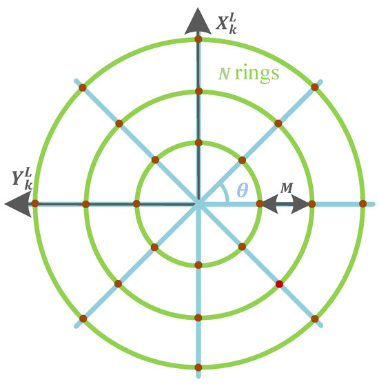 Then, we translate the position of the LiDAR scan by meters along the X-axis, Y-axis, and diagonally at a angle in the current LiDAR local coordinate system to generate multiple virtual positions, as shown in Figure 2. Where , M is the distance between rings, N is the number of rings, and represents the translation direction angle, where . The blue lines representing the translation directions intersect with the green rings at dark red points, which correspond to the virtual positions.