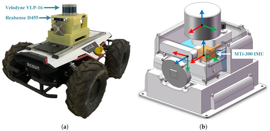 Experimental platform and sensor suite: (a) Mobile robot platform; (b) 3-D model of sensor suite.