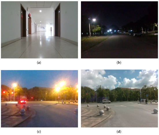 To compare the accuracy, robustness, and real-time performance of the proposed method with the baseline method, we conducted qualitative and quantitative comparisons and analyses in six aspects of the sequences recorded in these environments. These environments cover various lighting conditions, fully validating the adaptability of the algorithm in diverse challenging scenarios, as shown in Figure 5. To ensure a fair comparison, all methods were implemented on the same hardware platform: an Intel(R) Core(TM) i7-10750H CPU (Intel Corporation, Santa Clara, CA, USA) with 32 GB memory and an NVIDIA GeForce GTX 1660 Ti GPU (NVIDIA Corporation, Santa Clara, CA, USA).