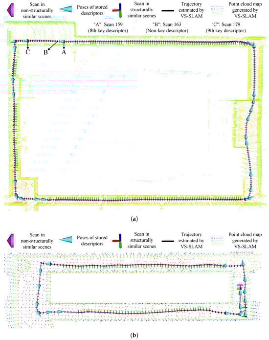 Second, we illustrate the process of determining key descriptors in the point cloud with another qualitative result, as shown in Figure 8. Initially, the descriptor from Scan 159 is identified as a key descriptor and stored in the loop closure database. Next, the descriptor generated from Scan 163 is found to be highly similar to the key descriptor of Scan 159, with a cosine distance below the threshold after the descriptor similarity calculation, so it is not stored in the database. Subsequently, Scan 179 and its corresponding descriptor are obtained. The descriptor of Scan 179 differs from the key descriptor of Scan 159, and the cosine distance exceeds the threshold after similarity calculation. Additionally, before similarity calculation, scene recognition is performed, confirming that Scan 179 is in a non-structurally similar environment, as shown by location “C” in Figure 6a. As a result, the descriptor corresponding to Scan 179 is marked as a key descriptor and stored in the loop closure database.