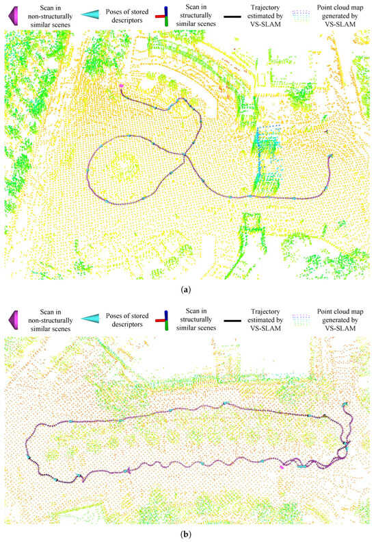 First, we present a qualitative result, visualizing scene recognition results, stored descriptor poses, and constructed maps on the trajectories of multiple sequences, as shown in Figure 6 and Figure 7. In the figures, the black lines represent the trajectories estimated by VS-SLAM, while the colored point clouds represent the maps built by VS-SLAM. The pink circular markers on the trajectory represent scans in non-structurally similar scenes, while the coordinate axes on the trajectory represent scans in structurally similar scenes. The blue arrows represent the poses of the key descriptors stored in the database. To enhance the clarity of the figures, we have added visual markers (legends) to explain the meaning of each marker. For both the simulation sequences and the corridor sequences recorded in the real world, the robot spends most of the time in the long corridor degenerate region with similar structure, as shown in Figure 6a,b, where most scans on the trajectory are represented by coordinate axes. Benefiting from the accurate scene recognition algorithm, our method only stores a small number of key descriptors from non-structurally similar scenes, as indicated by the blue arrows. This method not only reduces the memory consumption of the loop closure database but also improves the accuracy of loop closure detection in complex environments. For the sequences from the M2DGR dataset, the robot spends most of the time in feature-rich non-structurally similar areas, as shown in Figure 7a,b, where most scans on the trajectory are represented by pink spheres. As a result of the key descriptor evaluation, the SLAM system achieves robust loop closure detection by storing only a small number of key descriptors, as indicated by blue arrows.