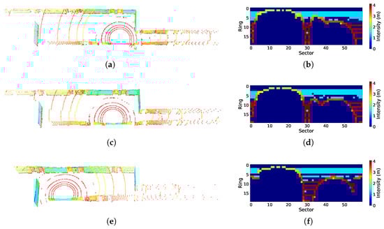 Illustration of key descriptor evaluation: (a) Point cloud of Scan 159 (8th key descriptor); (b) Descriptor of Scan 159 (8th key); (c) Point cloud of Scan 163 (Non-key descriptor); (d) Descriptor of Scan 163 (Non-key); (e) Point cloud of Scan 179 (9th key descriptor); (f) Descriptor of Scan 179 (9th key).