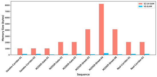 Finally, to provide a more intuitive comparison of memory consumption in the loop closure database, we present the results in Figure 9. In the figure, the blue bars represent the results of VS-SLAM, while the red bars represent the results of SC-LVI-SAM. Note that SC-LVI-SAM has the same data as VS-SLAM-w/o-st. The comparison clearly demonstrates that the proposed selective memory storage technique significantly reduces memory consumption.