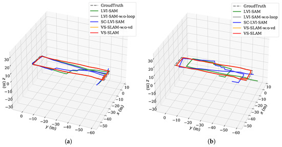 Finally, to further support the data in Table 2, we visualize the trajectories of different methods on the Gazebo-Corridor-01 and Gazebo-Corridor-02 sequences, as shown in Figure 10. To minimize the impact of motion trajectories and pose on system performance, these two sequences simulate counterclockwise and clockwise moving trajectories, respectively. In the figure, the trajectory of the proposed VS-SLAM (red) closely matches the ground truth, while the trajectories of LVI-SAM (green) and SC-LVI-SAM (blue) exhibit significant drift due to false loop closures. The accuracy of the remaining two methods is slightly lower than that of VS-SLAM. This visualization clearly demonstrates the superior accuracy and robustness of our proposed method.