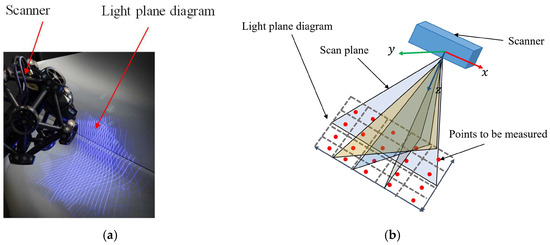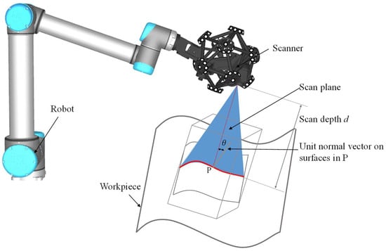 The laser scanner’s light plane is depicted in Figure 2b. In order to ensure the maximum measurement performance of the laser scanner, the multi-line structured light is equivalent to a rectangular area with fixed length and width values. The method we propose for generating robot scanning measurement paths is as follows: