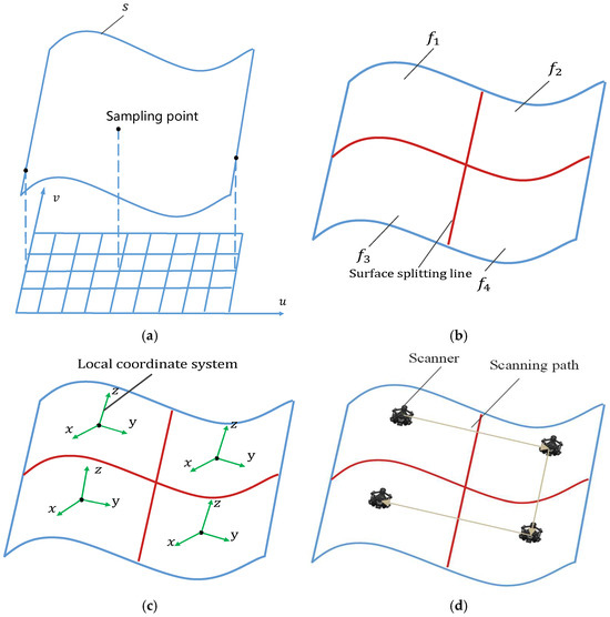 Step 2: As depicted in Figure 3b, the number of surface blocks is ascertained based on the scanning area of the laser scanner. The two-dimensional parameter space is equally partitioned along the u and v parameters, following which the two-dimensional parameters are reassigned to the three-dimensional parameter space. The surface is divided into surface blocks based on the u and v parameters.