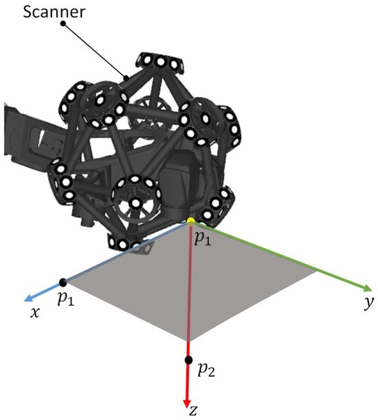The robot actuates the laser scanner to navigate to a specific pose in space, with its position anchored by the first point . The point on the z-axis coordinate axis is designated as the second point , and the point on the x-axis coordinate axis is designated as the third point . Thus, the segment from the first point to the second point is designated as the z-axis, while the segment from the first point to the third point is designated as the x-axis. The y-axis is determined following the right-hand rule of the coordinate system; thereby, the local coordinate system of the scanner is established. As the laser scanner is guided by the robot along the planned path, the aforementioned three points will trace out three paths in space. The position and orientation of the laser scanner are defined based on the coordinates of the points of three paths at any given instant collectively.