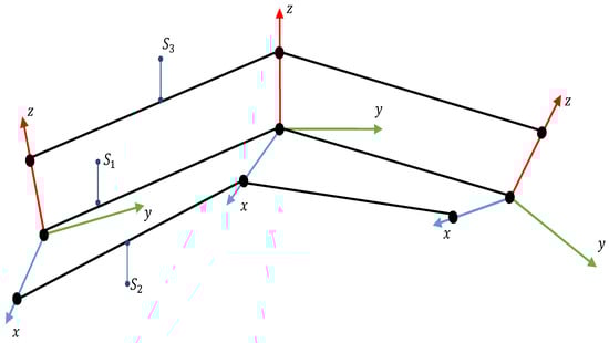 As illustrated in Figure 4, the position of the laser scanner within the workpiece coordinate system is defined by the vector . In three-dimensional space, there is no universal method for describing pose, as orientation is based on Lie group manifolds. Rotation matrices, Euler angles, and quaternions are among the commonly employed methods for representing spatial poses. Due to the convenience of matrix algebra, rotation matrices have become widely utilized in pose description. However, when industrial robots move along a continuous path, it is necessary to decouple direction. To achieve this, a pose mapping method that correlates a rotation matrix with three points on a triple curve is adopted, as depicted in Figure 5, which facilitates the synchronous representation of position and pose in space.