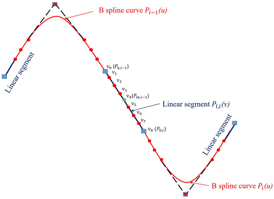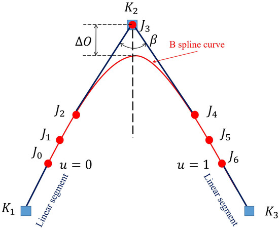 To maintain symmetry of the B-spline curves, the lengths of line segments and are kept equal. From Equations (34) and (35), the lengths of line segments , , and are , , and , respectively. The value of length is calculated by setting the directional error constraint .