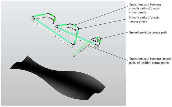 The scanning measurement path generated in Section 2 of this paper is shown in Figure 14. It can be observed that there are obvious acute, right, and obtuse angles at the corners. To smooth the corners, we apply the path smoothing algorithms proposed in Section 3 and Section 4 of this paper to smooth the position and orientation of the corners and obtain the smoothed scanning measurement path as shown in Figure 15.