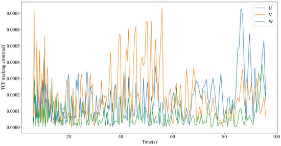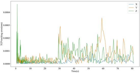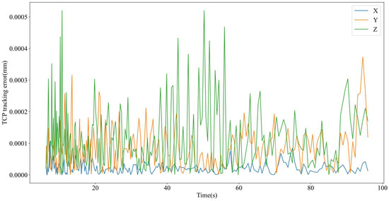 The variation of the TCP tracking error for robots is shown in Figure 17, Figure 18, Figure 19, Figure 20 and Figure 21. The maximum error of TCP tracking for two different path smoothing methods is summarized in Table 3. The root mean square error of TCP tracking for two different path smoothing methods is summarized in Table 4. By analyzing Table 3 and Table 4, it can be concluded that: