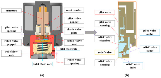 Structure schematic diagram of pilot-relief valve: (a) 3D Geometric Modeling; (b) 2D Geometric Model.