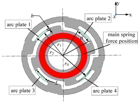 As shown in Figure 2 [13], the four connecting regions of the elastic valve plate are designated as arc plates n (where n = 1, 2, 3, 4). A parallel relationship is established among the four segments of the arc plate, and the deformation of each segment is assumed to be independent of the others. Furthermore, the size, shape, and deformation characteristics of each segment are considered identical. Consequently, the deformation of each segment can be approximated as the deformation of the elastic valve plate.