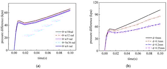 The influence of the arc plate angle on the pressure difference of the relief valve: (a) Pressure difference of the relief valve port for different θ at 0.25 mm pilot valve opening; (b) Pressure difference of the relief valve port for different pilot valve openings at θ = π/18rad.