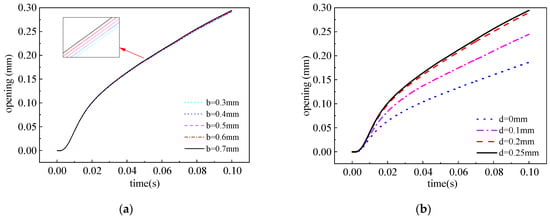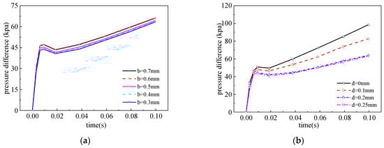 As seen in Figure 7a,b, when the opening d of the pilot valve remains constant, the stiffness of the elastic valve plate increases as the arc plate width b of the arc plate increases. This enhancement in stiffness of the series spring system regulates the movement of the relief valve poppet. Consequently, the inlet pressure at the valve port increases, leading to an increase in the system’s pressure difference. As a result, the resistance to valve opening increases, causing a decrease in the relief valve opening as b increases.