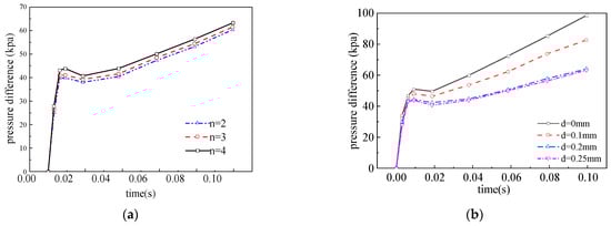 From Figure 5a,b, maintaining a constant pilot valve opening d while increasing the number of arc plates n enhances the elastic valve plate’s stiffness. This stiffness augmentation directly strengthens the series spring system controlling the relief valve poppet movement. The heightened system stiffness triggers intensified oil accumulation at the valve port, consequently amplifying the opening resistance. These cumulative effects systematically elevate the pressure difference across the relief valve with increasing n values.