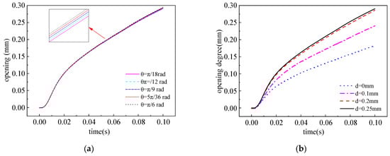 From Figure 6a,b, it can be observed that, for a constant the opening d of the pilot valve, as the stiffness of the elastic valve plate decreases with an increase in the arc plate angle θ of the elastic valve plate, the stiffness of the tandem spring system controlling the movement of the relief valve poppet also decreases. As a result, the pressure at the valve port decreases, and the accumulation of oil at the valve port becomes less pronounced. This leads to a reduction in the valve system’s pressure difference, causing the resistance to valve opening to diminish. Consequently, the opening of the relief valve increases as the arc angle θ of the elastic valve plate increases.