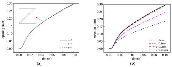 Figure 8a,b illustrate that when the opening d of the pilot valve remains constant, the stiffness of the elastic valve plate increases with the increase in the number of arc plates n, increasing the stiffness of the series spring system that controls the relief valve poppet. The oil buildup at the relief valve is strengthened, the relief valve opening resistance increases, and the opening of all the relief valves decreases with the increase in n.