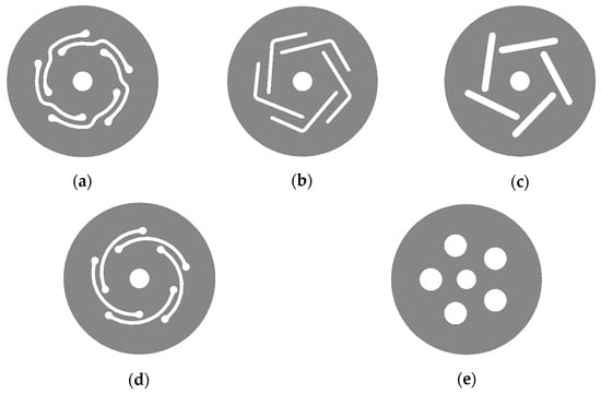 Structural types of the guide flow disc: (a) Irregular-shaped throttling orifice; (b) Bend-shaped throttling orifice; (c) Runway-shaped throttling orifice; (d) Arc-shaped throttling orifice; (e) Round hole-shaped throttling orifice.