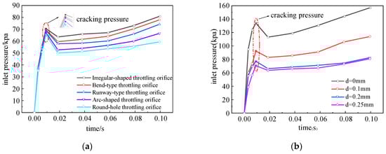 As depicted in Figure 10a,b, when the opening of the pilot valve is maintained at a constant level, the throttling orifice area of the guide flow disc increases in the following order: irregular-shaped, bend-shaped, racetrack-shaped, arc-shaped, and round hole-shaped. As the orifice area increases, the flow rate of oil passing through the guide flow disc also rises, resulting in a reduction in the flow rate of oil entering the relief valve. Consequently, the pressure within the relief valve chamber decreases, which results in a reduction in both the inlet pressure and the opening pressure. After the valve opens, the inlet pressure continues to decrease.