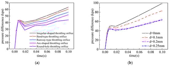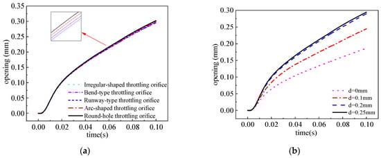 From Figure 12a,b with an unchanged opening d of the pilot valve, the relief valve opening increases in the following order: irregular-shaped throttling orifice, bent-shaped throttling orifice, runway-shaped throttling orifice, arc-shaped throttling orifice, and round hole-shaped throttling orifice. This phenomenon arises from the sequential mitigation of inlet fluid stagnation through optimized orifice geometries, leading to a corresponding reduction in pressure difference. As a result, the resistance to the opening of the relief valve decreases, and the opening increases gradually.