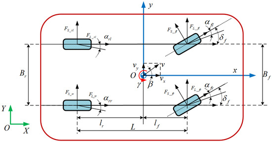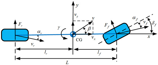 Among them, and , where and are the lateral stiffness of the front and rear axles, respectively. Assuming the front wheel steering angle is very small, then and .