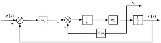where and are the two outputs of the instruction filter; is the input of the instruction filter. The initial state of the command filter is , . When is given, if the input signal satisfies , , and are normal constants, then for any , there exist and such that , , . Theoretically, by adjusting the values of the filter’s damping and bandwidth , any tracking accuracy can be achieved. The second-order command filter structure is shown in Figure 4.