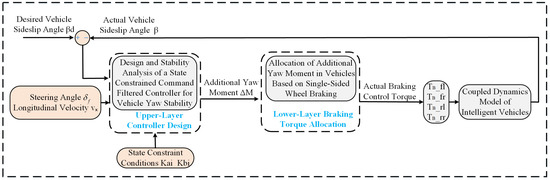 Figure 5 illustrates the yaw stability control architecture for intelligent vehicles. The process initiates with the upper-layer state-constrained command-filtered controller, synthesizing an additional yaw moment through real-time compensation of the deviation between the desired and measured centroid sideslip angles. This corrective moment is subsequently distributed via unilateral wheel braking strategies, where braking torque allocation algorithms determine actuation commands for specific wheels, thereby achieving precise yaw motion regulation.