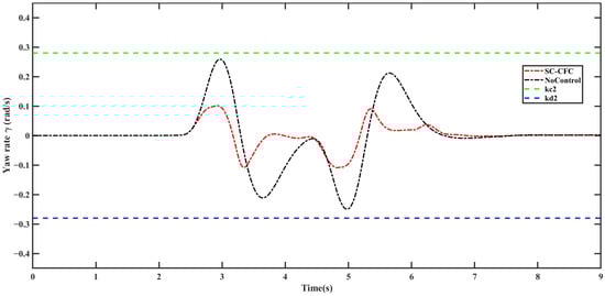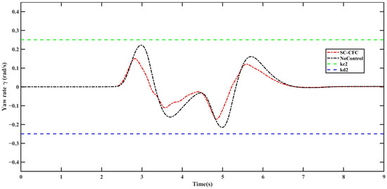 Considering the steering characteristics of drivers, the longitudinal velocity direction of intelligent vehicles should be as consistent as possible with the driver’s facing direction. Therefore, this study sets the desired vehicle centroid sideslip angle to 0 [29]. Research indicates that ordinary drivers with limited driving experience can still maintain normal control when . However, as the sideslip angle further increases, the driver’s control ability may deteriorate, thereby affecting driving safety. Consequently, this study constrains the centroid sideslip angle within [30]. Moreover, the yaw rate is influenced by vehicle speed and road surface adhesion conditions. Given these constraints, when the yaw rate satisfies [31], the vehicle can maintain stability within the entire operating range without experiencing loss of control.