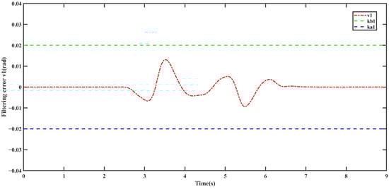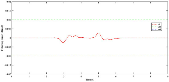 Figure 6 illustrates the bidirectional step input condition for the front wheel steering angle, where the absolute peak value reaches 0.075 rad. From Figure 7, it can be observed that, under the control of the SC-CFC controller, the centroid sideslip angle of the intelligent vehicle closely follows the desired value. Additionally, during the commanded front wheel steering angle transitions, the state variations in the vehicle remain significantly below its constraint boundaries and . In contrast, under uncontrolled conditions, when the front wheel steering angle is relatively large, the amplitude of centroid sideslip angle variation is more pronounced. However, at this moment, the vehicle is still within the stability constraint boundaries. From Figure 8, it can be seen that in the absence of the controller, when the front wheel steering angle is large, the vehicle’s yaw rate approaches its constraint boundaries, indicating a potential risk of vehicle loss of control during steering. Conversely, with the SC-CFC controller, the yaw rate remains constrained within the stable region and throughout the entire control process, effectively ensuring the vehicle’s driving stability. Furthermore, from Figure 9 and Figure 10, it is evident that the filtering errors remain within the constraint boundaries throughout the process, verifying the effectiveness of the SC-CFC controller.