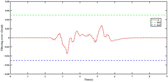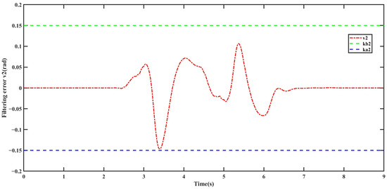 In Operating Condition 2, the front wheel steering angle input remains the same as in Operating Condition 1. From Figure 11, it can be observed that, under the control of the SC-CFC controller, the centroid sideslip angle of the intelligent vehicle closely follows the desired value. Additionally, during the commanded front wheel steering angle return for lane change, the vehicle’s state variables remain consistently below their constraint boundaries and . However, under uncontrolled conditions, when the front wheel steering angle is relatively large, the variation in centroid sideslip angle increases significantly, even exceeding the stability constraint boundary. This indicates that the intelligent vehicle is highly prone to instability in this scenario, posing a considerable risk of traffic accidents. From Figure 12, further validation can be obtained: under uncontrolled conditions, when the front wheel steering angle is large, the yaw rate essentially approaches its constraint boundaries, further demonstrating the high likelihood of vehicle loss of control. Conversely, under the control of the SC-CFC controller, although the yaw rate exhibits some oscillations throughout the process, it remains constrained within the stable region and at all times, effectively ensuring vehicle driving stability. Similarly, from Figure 13 and Figure 14, it can be observed that the filtering errors remain constrained within the specified boundaries throughout the entire process.