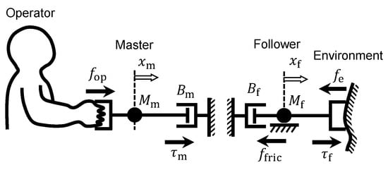 The operational force applied by the operator, the leader driving force , and the leader viscous force act on the leader, which has a mass . These forces generate an acceleration . The equation of motion for the follower is expressed by Equation (2).