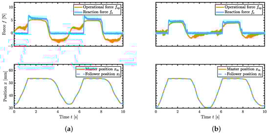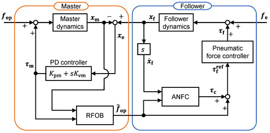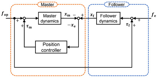 Figure 2 shows the basic structure of the force-projecting type, which directly projects the operational force to the follower driving force and reproduces the follower position at the leader. Namely, the follower does not have a position controller and only needs to transmit its current position to the leader, eliminating the need for external force measurement. These characteristics provide significant advantages for pneumatic driving systems with low positioning rigidity and high back-drivability. The impact of the follower dynamics on this control method is theoretically explained based on the transparency [].