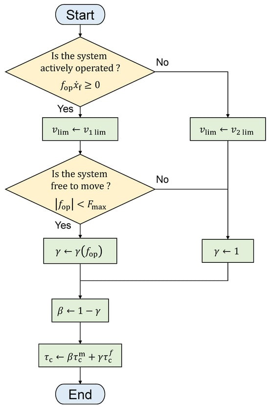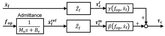 In this section, the implementation of the algorithm defined in the previous section is described. Figure 5 shows a flowchart of the process by which the compensation force is determined. in Figure 5 shows the smoothing function in Equation (18). The value of used in Equations (13) and (14) is set separately depending on whether the operator is actively moving the system or the system is being passively moved by the environment . When the operator is actively moving the system, it is set as . When the system is being moved passively, it is set as . The relationship between and is set as . This is to prevent the system from becoming unstable due to the unstable operational force when actively operating the system. When the system is being passively moved by the environment, the current velocity is used (). When the magnitude of the operational force is greater than or equal to the maximum static friction force (i.e., ), the environmental reaction force can be considered to be balanced by the operational force and the follower’s dynamic state. Therefore, the current velocity is referenced . On the other hand, when the operator is actively moving the system, and when the magnitude of the operational force is less than the maximum static friction force (i.e., ), the follower can be considered free to move. Therefore, the reference velocity is also used . Once the mixing ratio is obtained, the other mixing ratio can be determined by the relationship in Equation (16). Finally, the compensation force can be obtained according to Equation (15).