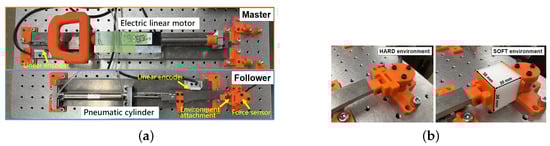 Configuration of the experimental system []. (a) 1-DOF leader–follower system; (b) Two types of environmental walls connected by the follower cylinder rod.
