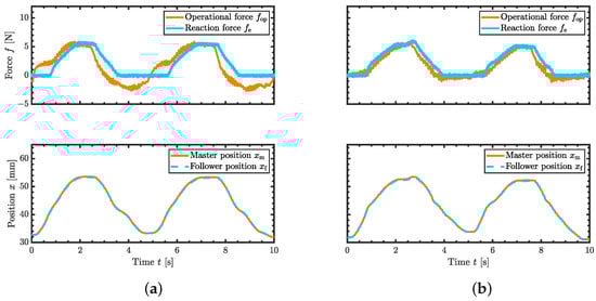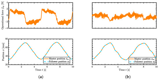 Second, the results of the transfer function of the position error are described. Since a small position error is desirable, its gain should also be small. Figure 12a,b show that in both environments, the gain value is kept below approximately −26 dB. These are good results in which the positioning stiffness of the electric leader functioned effectively, as in the experiments in our previous study [].