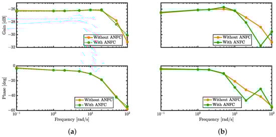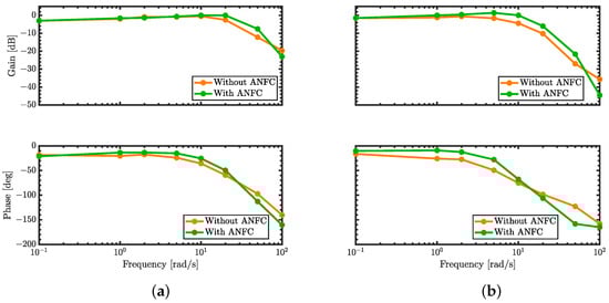 First, the results of the force transfer function are described. Ideally, its gain should be zero because the operational force and environmental reaction force should be equal in magnitude, as shown in Equation (7). In Figure 11a, since the follower is quasi-static, constrained by a hard wall, generally similar characteristics were obtained with and without the ANFC. However, a slight difference was observed around 20 rad/s, suggesting that the effect of the ANFC functions predominantly. In the response of in the SOFT environment shown in Figure 11b, since the follower was able to move under the environmental reaction force, the effect of property improvement by the ANFC was more pronounced. Note that no force resonance was observed in both environments.