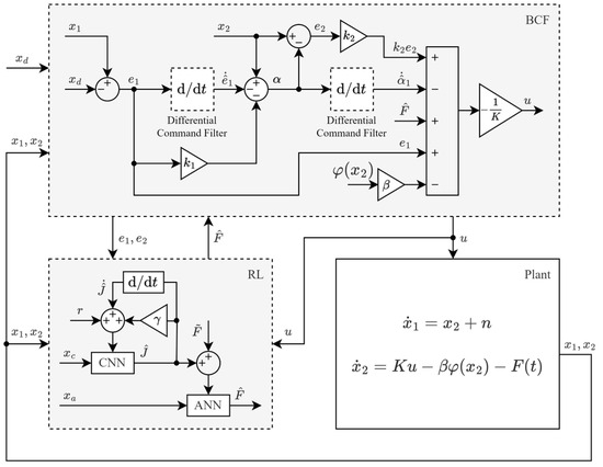 The BCF-RL controller was designed to address technical challenges in electromechanical servo systems. It consists of a BCF main controller and an RL auxiliary controller. The BCF main controller integrates a command filter into the backstepping control, enhancing the system’s response speed and significantly reducing errors caused by measurement noise. This improves the robustness and accuracy of the system. The RL auxiliary controller handles the online estimation of unknown disturbances in the system. Utilizing critic and actor neural networks, the RL auxiliary controller adapts to dynamic changes and effectively estimates the complex nonlinear disturbances. This combination enhances the adaptive capability of the system and improves the stability and reliability of the controller for practical applications. The controller structure is illustrated in Figure 2.