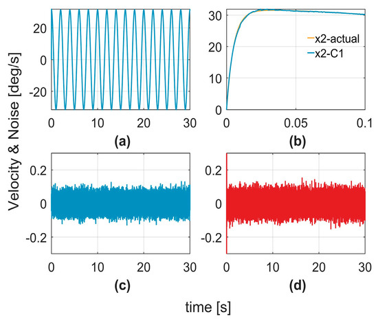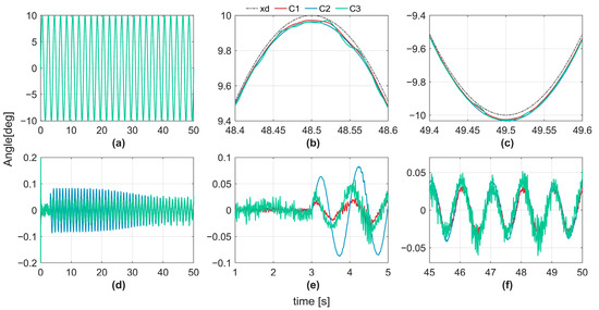 Considering the diversity and complexity of actual working conditions, position–velocity–input interference is used to test the control effect of the controller, that is, the actual input of the plant is 0.5u − 0.2x1 + 0.05x2. Compared with Case 1, there are significant changes in the structural and unstructured uncertainties in this situation.