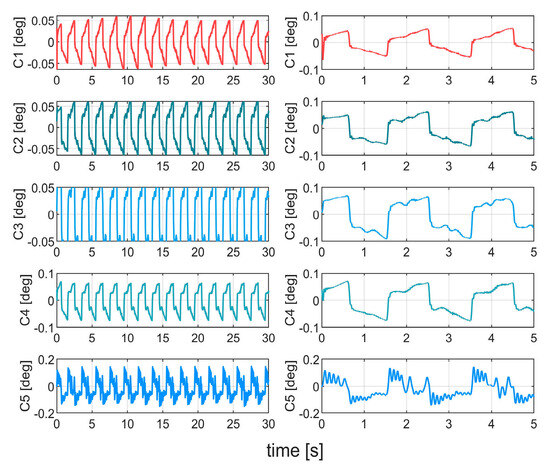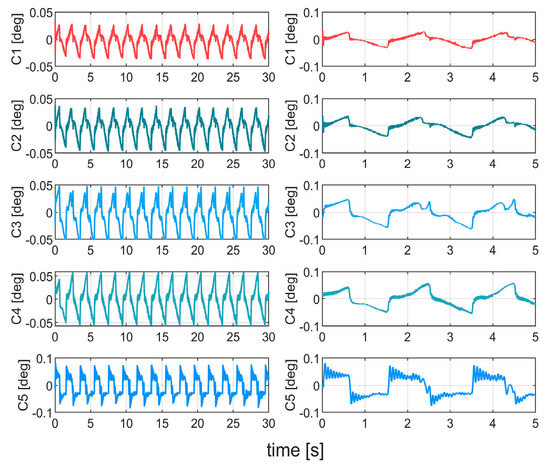 The confidence interval analysis presented in Table 5 indicates that C1 exhibits the lowest mean tracking error (0.0418 deg) and the narrowest confidence interval ([0.0329, 0.0507]), demonstrating the smallest error and highest stability. In comparison, C2 has a slightly higher mean (0.0474 deg) and a marginally wider interval ([0.0375, 0.0573]); the confidence intervals of C3, C4, and C5 progressively increase in both mean and width, with C5 showing the highest mean (0.0835 deg) and the widest interval ([0.0671, 0.0999]), indicating the greatest variability. Overall, C1 outperforms C2, C3, C4, and C5 in terms of both mean error and stability, making it the optimal controller among the five.