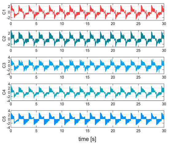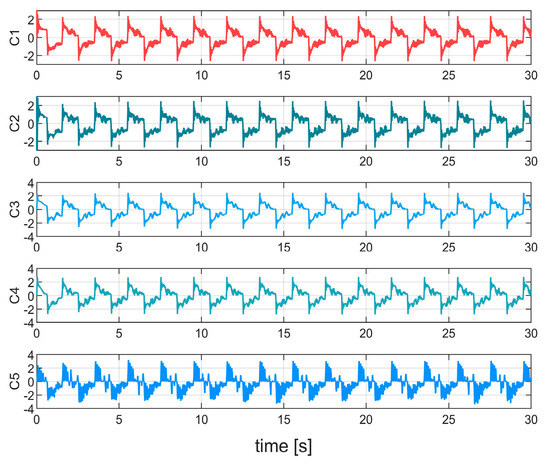 To further quantify the performance advantage of the C1 controller, this study employed an independent samples Welch’s t-test (two-sample t-test assuming unequal variances) for inter-group difference analysis. As shown in Table 6, using C1 as the baseline, one-tailed tests (α = 0.05) were conducted against C2–C5. The null hypothesis was defined as , indicating no difference in mean error between C1 and the i-th controller; the alternative hypothesis was , suggesting that C1’s mean error is less than that of the iii-th controller. The one-tailed critical t-value, based on degrees of freedom , was approximately −1.686 from the t-distribution table. The t-value was calculated using the following formula: