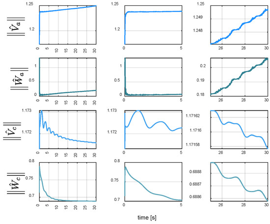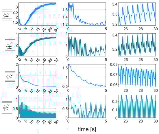 As shown in Figure 13 and Table 4, under complex conditions, C5 exhibits the largest steady-state tracking error of 0.12°, while the improvement of C4 is limited. Compared with C5 and C4, C3 achieves a 37% and 11% reduction in error, respectively. By employing neural network-based disturbance estimation and compensation, C2 further reduces the error to 0.064°. C1 achieves the lowest tracking error of 0.05°. The comparison of control inputs in Figure 14 confirms that C1 achieves the best tracking while maintaining low energy consumption. The disturbance estimation in Figure 15 and the variation of weight norms in Figure 16 reveal that, despite the increased complexity, the actor-critic network remains convergent, and the reinforcement learning-assisted controller ensures stable operation under adverse conditions.